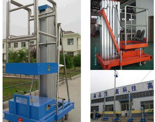 雙柱鋁合金升降機(jī):升降動(dòng)力分為220V、 380V,或電瓶動(dòng)力源,特殊環(huán)境也可采用防爆泵站及防爆電器。升高4——10米,載重100-150公斤。主體采用高強(qiáng)度優(yōu)質(zhì)鋁合金材料,具有造型美觀、體積小、重量輕、升降平穩(wěn)、安全可靠等優(yōu)點(diǎn)。廣泛用于工廠、賓館、餐廳、車站、影劇院、展覽館等場(chǎng)所,是保養(yǎng)機(jī)具、油漆裝修、調(diào)換燈具、電器、清潔保養(yǎng)等用途的最佳安全伴侶。